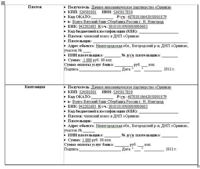 Квитанция на оплату Членских взносов в формате PDF и DOC для посёлка Оринки
